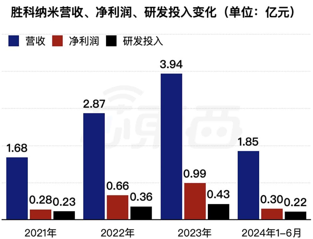 2021年~2024年上半年胜科纳米营收、净利润、研发投入变化(单位:亿元,芯东西制图)