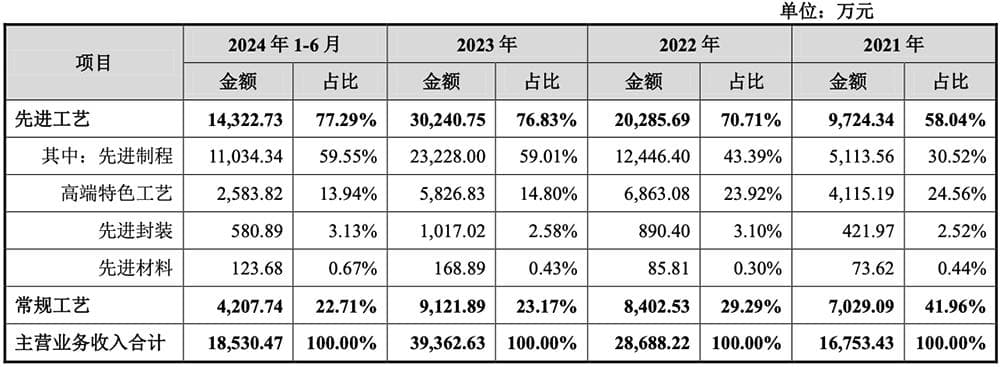 报告期各期,该公司来自于先进制程(28nm及以下制程)、高端特色工艺(高性能模拟芯片、高集成度射频芯片、高容量内存芯片、高密度光电器件、功率半导体器件等)、先进封装(混合键合、晶圆级封装、2.5D 封装、3D 封装、系统级封装等)、先进材料(第三代半导体材料、大硅片、光刻胶)等先进工艺领域的收入规模较高且逐年上涨,今年上半年收入占比已达77.29%。