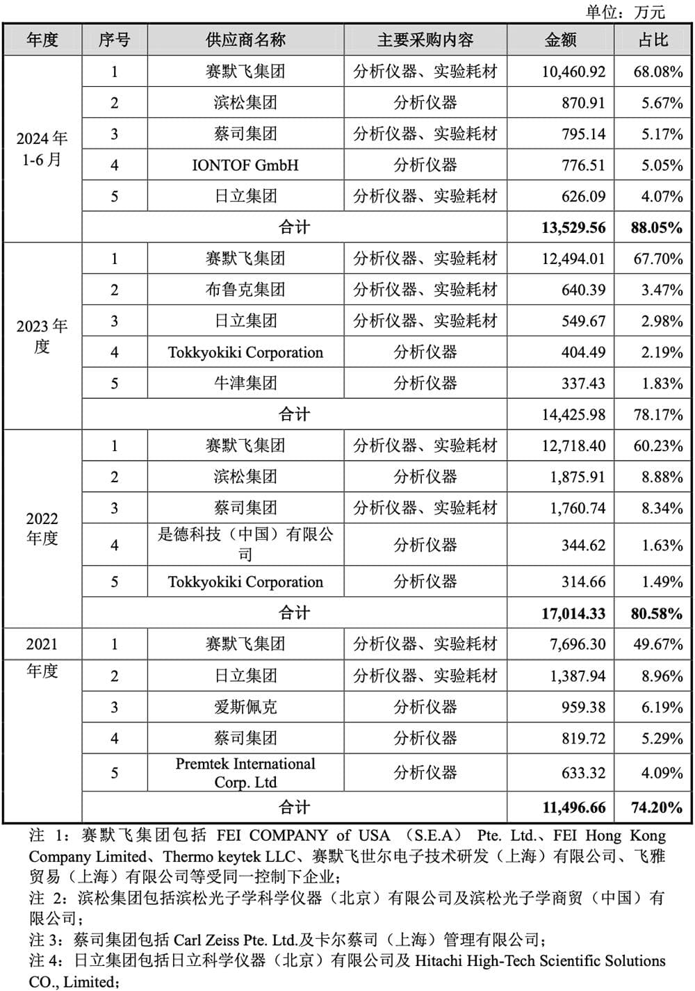 报告期内,胜科纳米重要供应商包括赛默飞集团、滨松集团、蔡司集团、日立集团、Micro Control Company等,对第一大供应商的采购金额占采购总额比重分别为49.67%、60.23%、67.70%、68.08%。