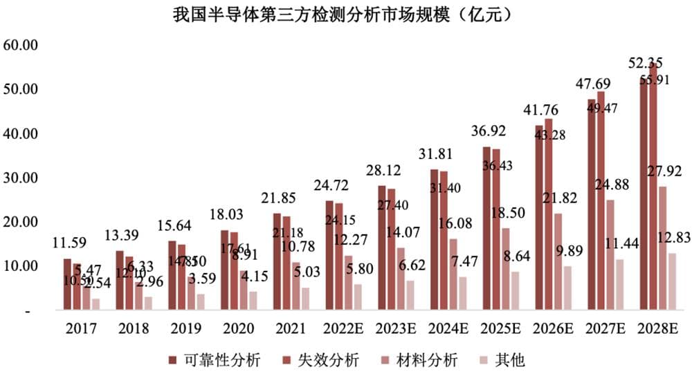 根据QY Research数据,2023年我国半导体第三方检测分析领域中,可靠性分析是其中规模最大的业务板块,市场规模约28.12亿元;失效分析市场规模约27.40亿元,材料分析市场规模约14.07亿元。