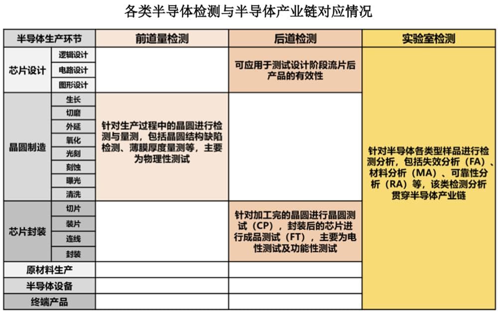 对应到半导体产业链,前道量检测主要应用于晶圆加工制造环节,检测对象是工艺过程中的晶圆;后道检测主要用于晶圆制造工艺完成后的芯片的电性测试及功能性测试;失效分析、材料分析等半导体实验室检测需求则来自半导体产业链各类型客户,主要针对失效样品进行缺陷定位与故障分析,帮助客户实现问题判定,提高产品良率。