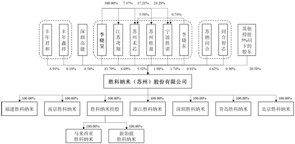 截至招股书签署日,胜科纳米的控股股东、实际控制人李晓旻过直接和间接方式合计控制胜科纳米59.72%的股份,包括直接持股43.79%,以及通过江苏鸢翔、苏州禾芯、苏州胜盈、宁波胜诺间接持股。