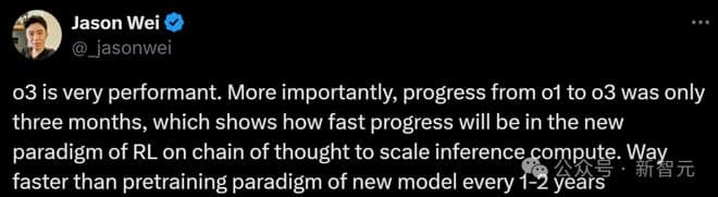 OpenAI著名研究员Jason Wei也表示,更加关键的是,从o1到o3的进步也仅仅只用了3个月,这说明了在推动人工智能领域发展方面来讲,强化学习驱动的推理扩展计算范式,会比预训练基础模型的传统扩展范式快得多。