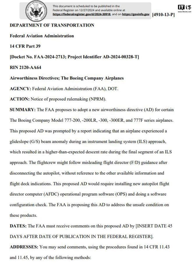 IT之家 12 月 26 日消息,美国联邦航空管理局(FAA)今日对波音公司的部分 777-200、777-200LR、777-300、777-300ER 和 777F 系列飞机发布了新的适航指令(AD)。