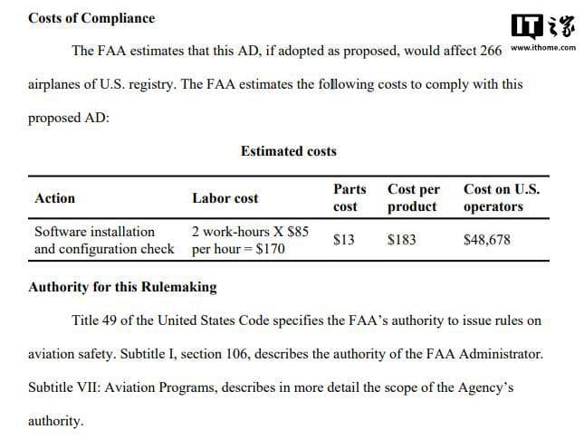 IT之家注意到,美国联邦航空管理局预计将影响 266 架在美国注册的波音飞机,预估遵守该指令的成本如下: