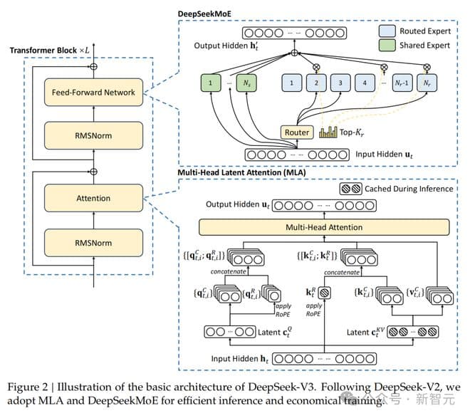 它继续采用了多头潜在注意力(MLA)来实现高效推理,以及DeepSeekMoE实现低成本训练。
