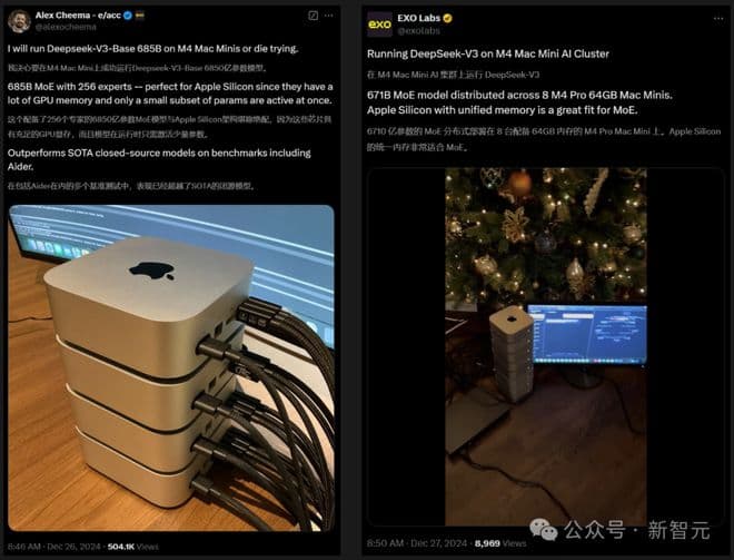 国外AI发烧友们纷纷开启了测试,有人直接将4/8个M4 Mac mini堆叠在一起来运行DeepSeek-V3了...