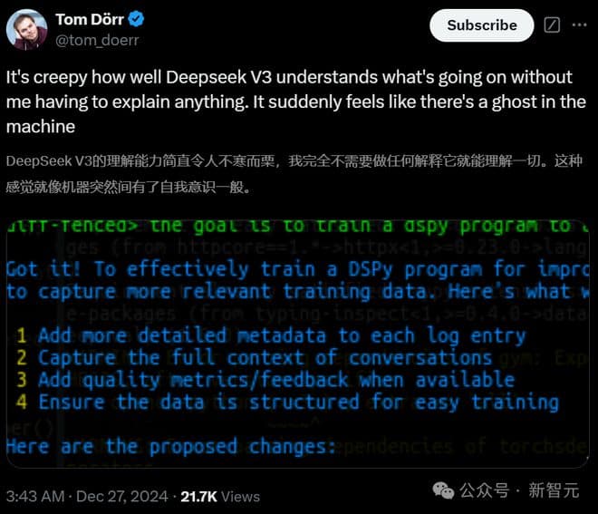 一位开发者惊讶地表示,DeepSeek-V3无需我解释就能如此准确地理解一切,这种感觉真让人毛骨悚然。就好像机器里真的住着一个幽灵似的。