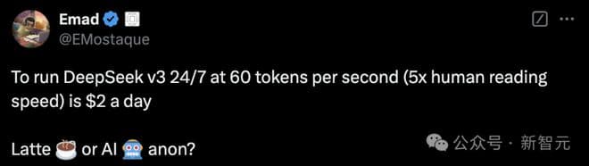 Stability AI前CEO表示,以每秒60个token(相当于人类阅读速度5倍)的速度全天候运行DeepSeek v3,每天仅需要2美元。