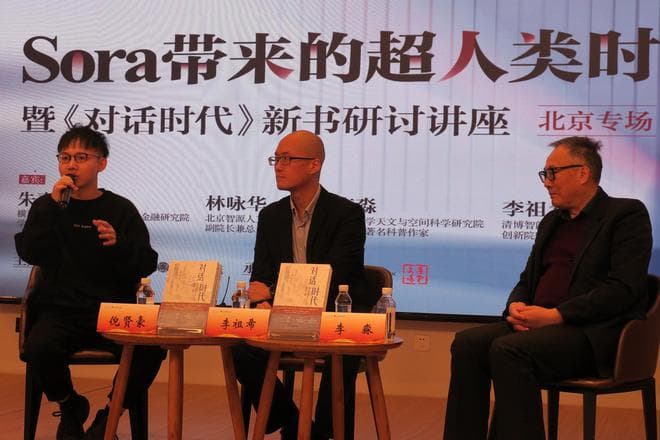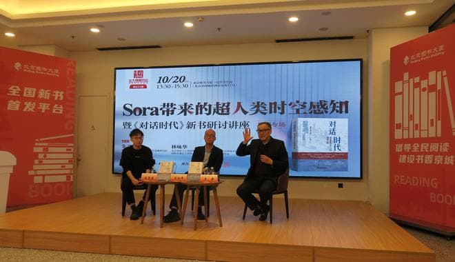 由北京图书大厦、北京大学出版社主办,北大博雅讲坛、文汇讲堂工作室承办的北大博雅讲坛624期"Sora带来的超人类时空感知暨《对话时代》新书研讨讲座(北京专场)"现场 ,李淼、李祖希和倪贤豪就朱嘉明视频里提出的话题展开热烈讨论