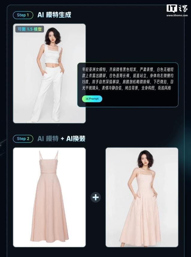 IT之家 12 月 27 日消息,快手今日宣布,可图 1.5 图像模型发布,画面质量及美感大幅提升。AI 试衣新增“AI 模特”功能,输入文本描述即可生成 AI 模特,配合 AI 换装及可灵 1.6 图生视频,可生成服装展示视频。