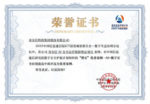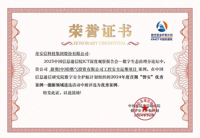 奇安信凭借其创新的安全解决方案脱颖而出,旗下两个项目——“奇安信AI安全运营保障奥运项目”和“新奥(中国)燃气投资有限公司工控安全运维项目”,双双被评为首期“磐安”优秀案例。这标志着奇安信在利用人工智能技术提升数字安全方面取得的重要突破。