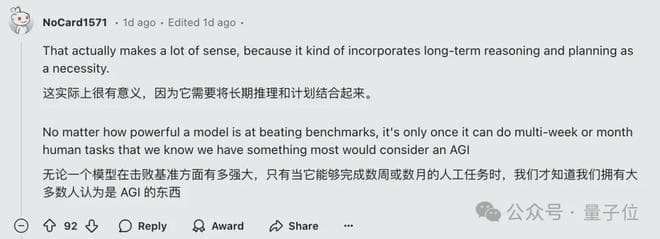 有人认为,如果模型可以达到人类需要数周或数月才能完成的任务,也就代表它可以将长期推理和计划结合起来,也就和真正的AGI差不多了: