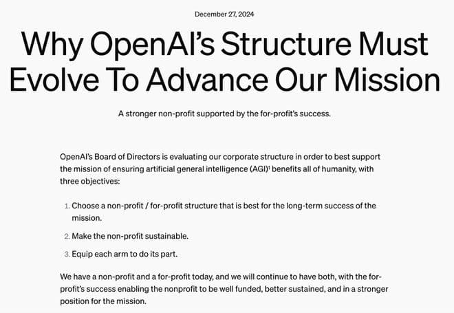 12月27日,圣诞假期归来,OpenAI官方宣布,计划于2025年正式调整公司结构:将现有的非营利组织控制下的营利部门重组为一家特拉华州公共利益公司(PBC)。新架构将通过传统股权形式吸引资本,同时保留OpenAI的原始使命。