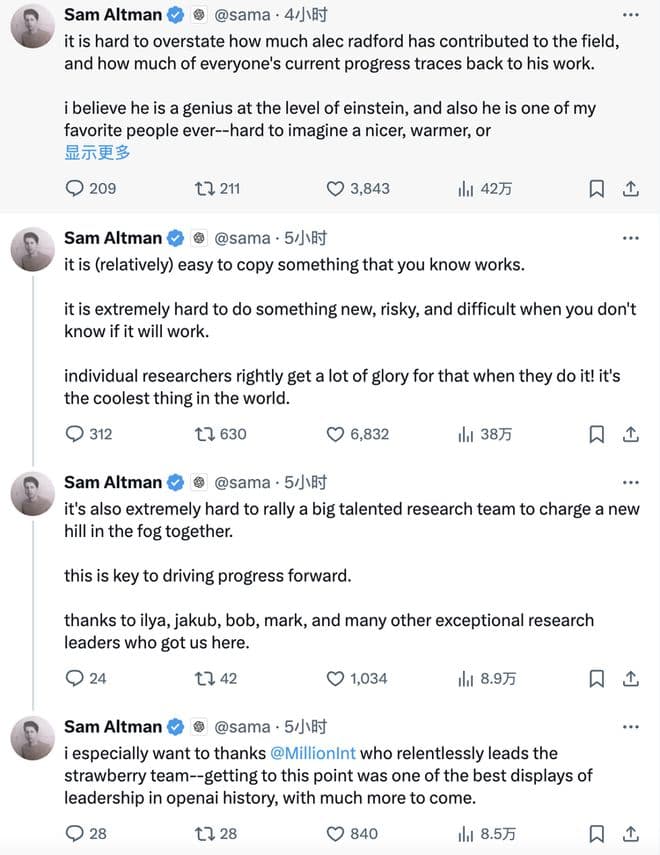 奥特曼这边,则发了4条推文表达对OpenAI研究员们的肯定:“复制已有成果相对容易,而进行全新的、有风险的、难度大的尝试却非常困难,尤其在成功未知的情况下。个体研究人员为此获得的赞誉是完全应得的,因为他们从事的是世界上最酷的工作。”