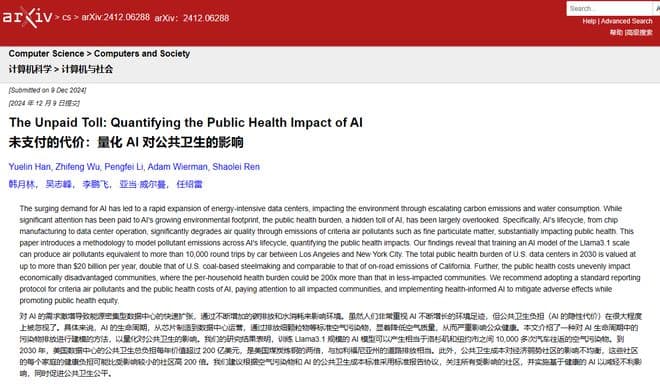 IT之家 12 月 29 日消息,一项最新研究表明,从芯片制造到数据中心运营,人工智能正在加剧空气污染。在一篇名为《未付出的代价:量化人工智能对公共健康的影响》的论文中,科学家指出,到 2030 年,这种污染可能导致每年多达 1300 人过早死亡。此外,由此产生的公共卫生支出 —— 包括治疗癌症和哮喘的费用,以及因病缺勤、缺课造成的损失 —— 预计每年将达到约 200 亿美元(IT之家备注:当前约 1460.5 亿元人民币)。