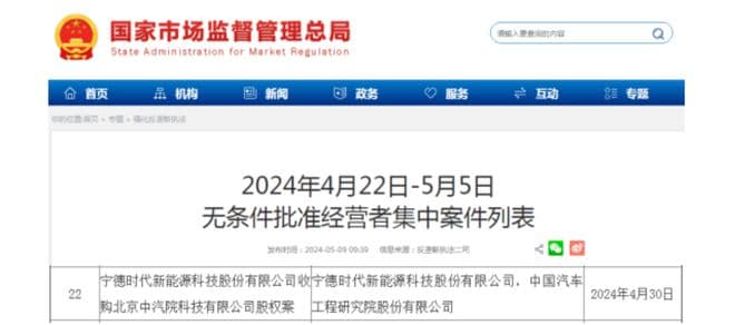 而在今年5月9日,国家市场监管总局最新发布的无条件批准经营者集中案件名单显示,宁德时代新能源科技股份有限公司收购北京中汽院科技有限公司股权案通过审批。