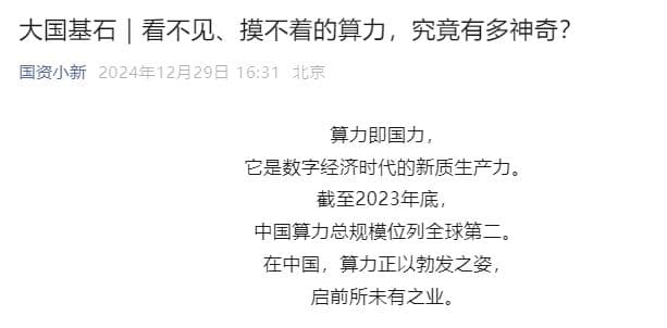 据国资小新,12月28日18时20分,由央视和国务院国资委联合制作的大型系列纪录片《大国基石》,推出第三期——《算力引擎》,其中明确强调:“算力即国力,它是数字经济时代的新质生产力。截至2023年底,中国算力总规模位列全球第二。在中国,算力正以勃发之姿,启前所未有之业。”