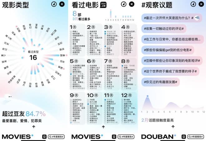 豆瓣用非常简洁高效有设计感的呈现方式,让大家能快速 get 到这一年的观影、读书重点。
