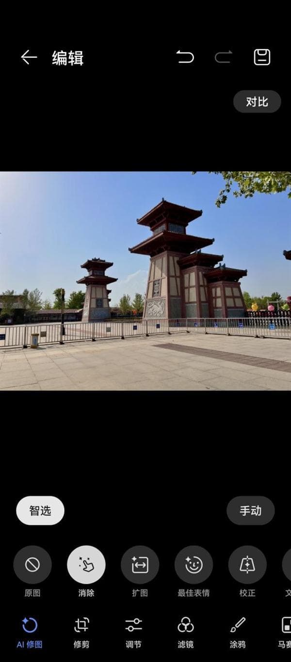 在相册中挑选出需要优化的照片,进入“AI修图”界面,点击“消除”按钮后,用户仅需简单圈选想要移除的对象,无论是穿梭的行人、碍眼的垃圾桶还是错综复杂的电线杆,皆可一键处理。
