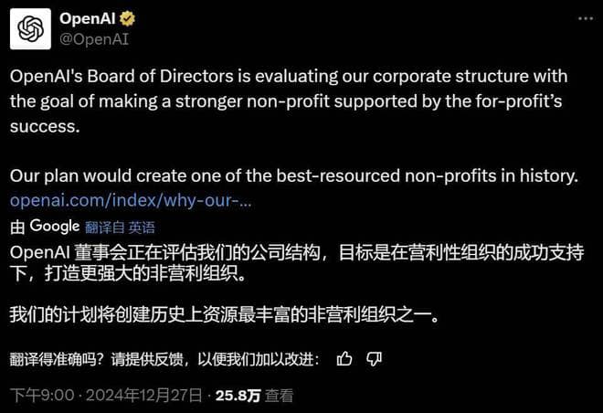 今年年中时,就有媒体预测 OpenAI 将在 2025 年转为营利性机构,但似乎这一进程不得不加快了。
