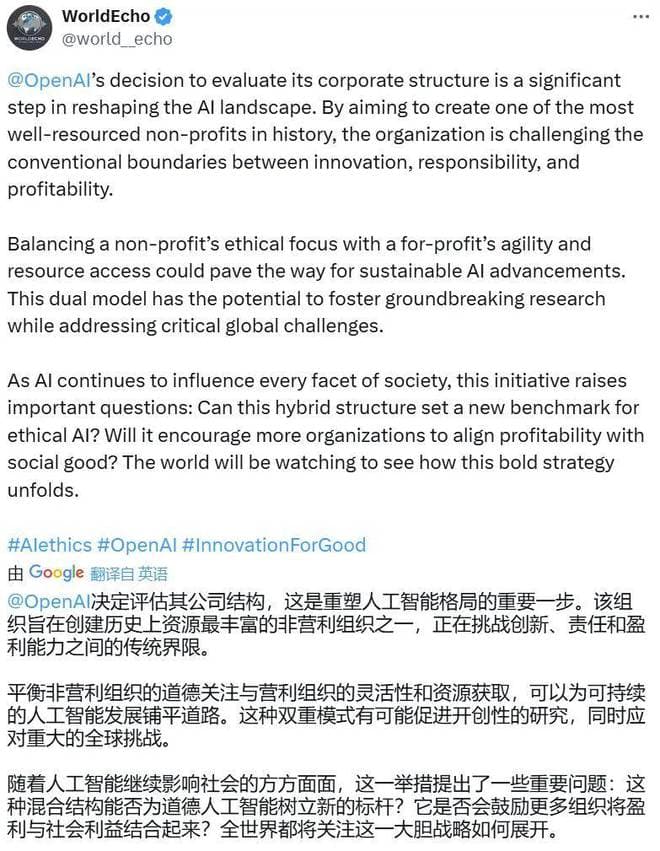 目前,大型公司在人工智能开发上的数千亿美元投资,显示了 OpenAI 继续追求使命所需的真正投入。我们需要再次筹集比我们想象的多的资本。虽然投资者想要支持我们,但在如此大规模的资本面前,他们需要常规的股权结构,而不是过于固化的结构。