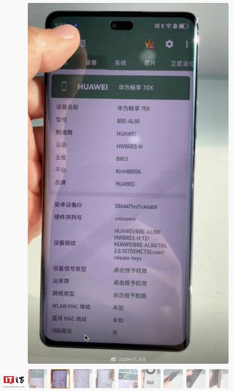 IT之家 12 月 30 日消息,华为畅享70X手机爆料消息近期不断,目前博主@WHYLAB直接公布了这款手机的大部分规格信息及设备照片,该机型号BRE-AL80,据称“可以看作是换用麒麟处理器的麦芒30 手机”。