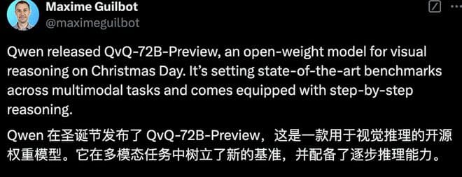 网友们开始用上的包括Qwen团队送上的圣诞礼物:QVQ-72B-Preview。这是一款能够分析图像并进行推理的全新开源模型。虽然还处于实验阶段,但初步测试表明,它在视觉推理任务中表现相当出色。