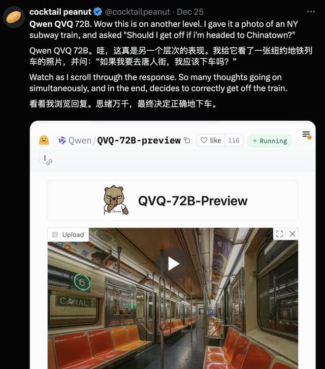 在实际测试中,一位网友拍了一张纽约地铁照片考验QVQ,并提问“如果我要去唐人街,我该在这站下车吗?”用户最终表示模型做出了正确的判断,结合问题进行了有效的推理。