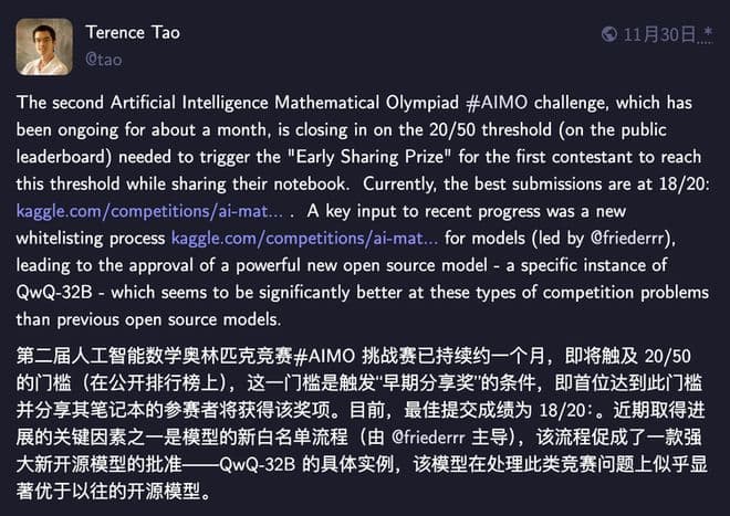 虽然QwQ目前还处于实验阶段,但它展现出的强大分析能力和独特的推理方式,已经吸引了不少目光,甚至连数学界的大牛陶哲轩都公开点赞,说它的表现超越了以往的所有开源模型。