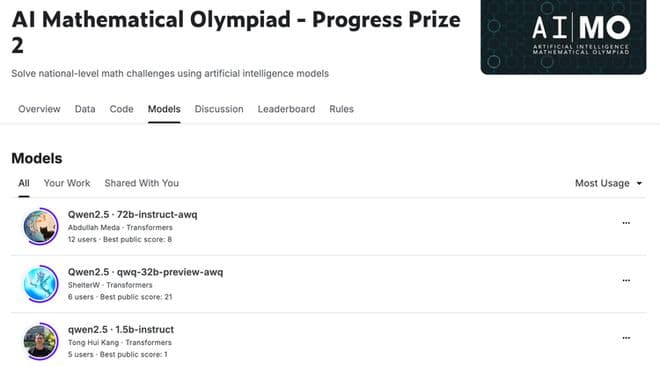 在 AIMO(AI 数学奥林匹克)挑战赛中,Qwen 系列模型也成为了参赛者们最常用的模型之一,位列前三。