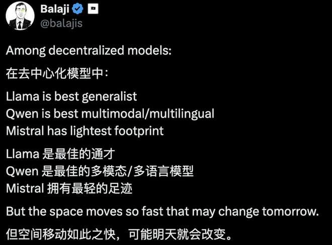 知名投资人Coinbase前CTOBalaji Srinivasan也公开认可了 Qwen 的多模态和多语言能力。
