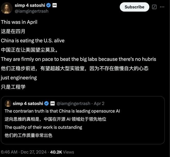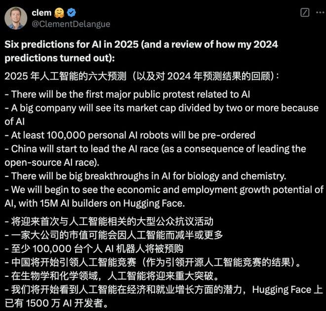 Hugging Face的 CEO Clem在其2025年AI预测中甚至提到,中国将开始引领人工智能竞赛,这主要得益于其在开源人工智能竞赛中的领先地位。