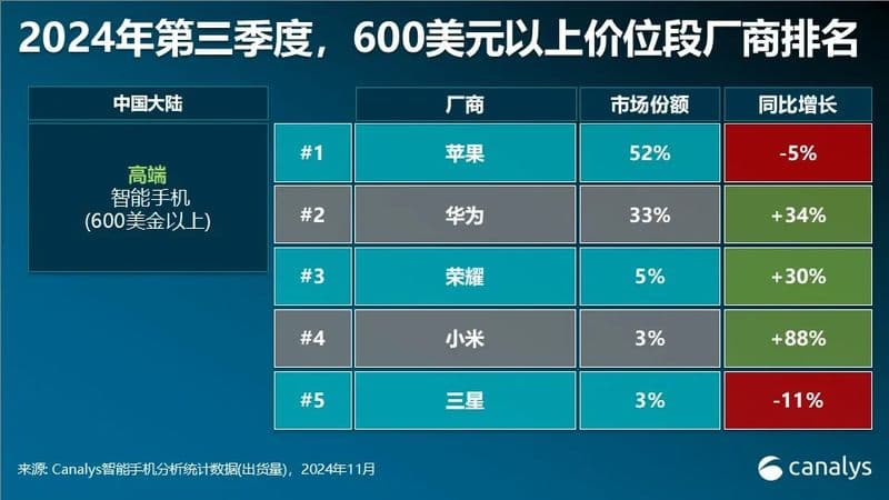 中国市场的增幅同样客观。据Canalys数据,2024年三季度,中国智能手机市场的平均单价相比去年有明显提升,三季度600美元以上的高端手机市场份额达到29.3%,同比增长3.7个百分点。