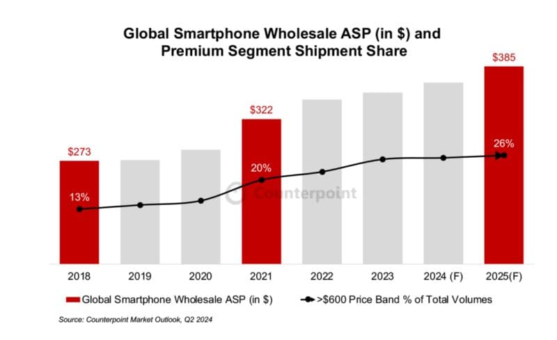 据Counterpoint Research数据,2023年,全球高端智能手机市场同比增长16%,而整体市场同比下降1%。此外,2024年上半年,该细分市场的销售额同比增长8%,而整体市场同比增长4%。