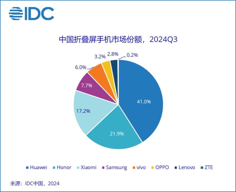 据IDC数据,2024年第三季度,中国折叠屏手机出货量达到223万台,其中荣耀以21.9%的市场份额,排名第二,仅次于华为,其中横折和竖折产品位列市场二三位。