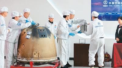 6月26日,在中国航天科技集团五院举行的嫦娥六号返回器开舱仪式现场,科研人员取出月球样品容器准备称重。 新华社记者 金立旺摄