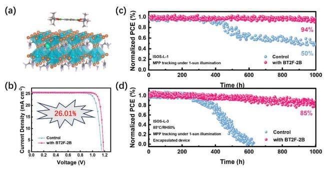 团队表示采用该方法制备的反式单结 PSCs,光电转换效率(PCE)超过 26%。在 85℃高温和 50% 相对湿度条件下,经过 1000 小时老化测试后,电池仍能保持 85% 的初始效率。