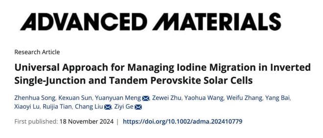 相关研究成果以 Universal Approach for Managing Iodine Migration in Inverted Single-Junction and Tandem Perovskite Solar Cells 为题,发表在《先进材料》(Advanced Materials)上。研究工作得到国家杰出青年科学基金、国家自然科学基金和中国博士后科学基金的支持。