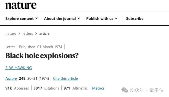 1974年,霍金在《自然》杂志上发表了一篇名为《黑洞爆炸?》的论文。他运用量子理论,研究了在黑洞附近的物质的行为,惊奇地发现黑洞具有温度。换言之,黑洞也能产生辐射,这就是著名的“霍金辐射”。