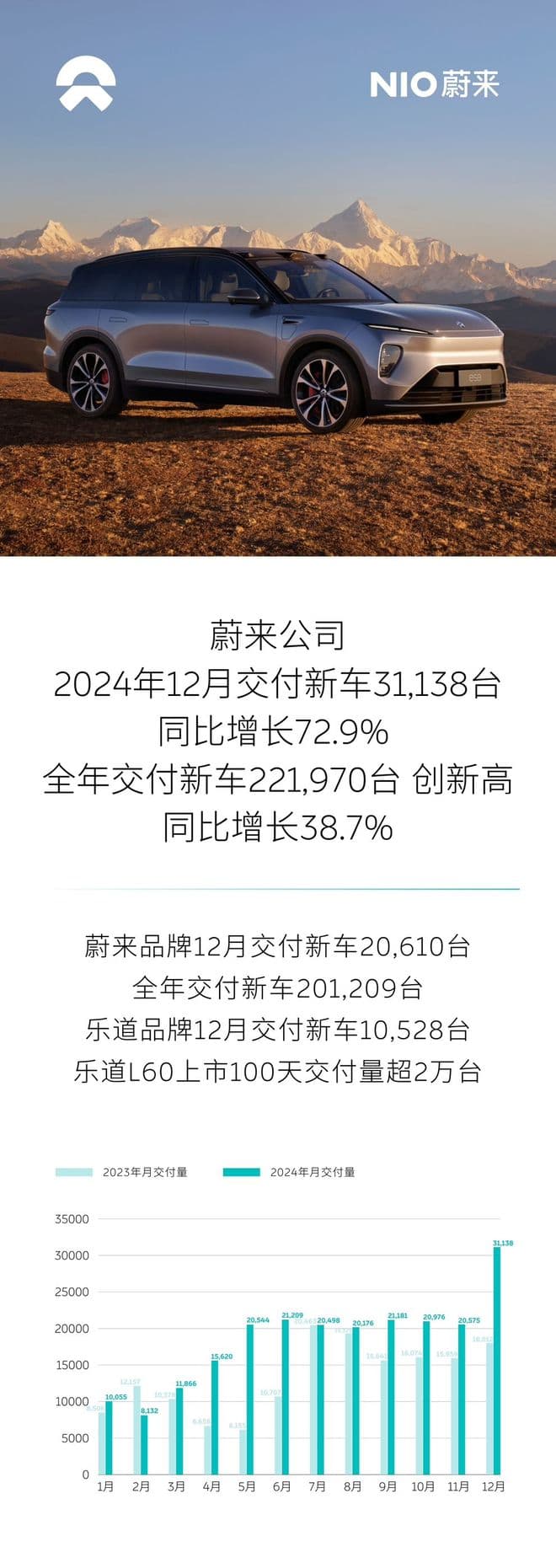 2024年12月,蔚来公司交付新车31138台,单月交付突破3万台创新高,环比增长51.3%,同比增长72.9%。其中,蔚来品牌交付新车20610台;乐道品牌交付新车10528台。
