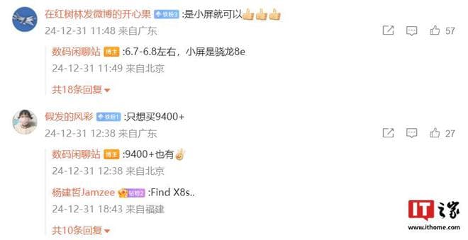 博主还回复了网友部分问题:针对新机是否为小屏设计,博主称“6.7-6.8 左右,小屏是骁龙 8e”;针对是否会推出天玑 9400+ 处理器手机新品,博主表示“9400+ 也有”(此处暗指一加新机)。