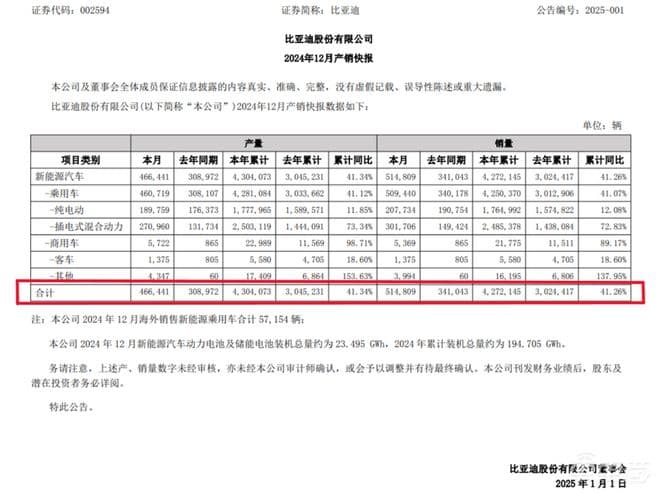 车东西1月1日消息,就在刚刚,比亚迪正式公布2024年12月的销量为51.48万辆,2024年全年销量为427.21万辆。
