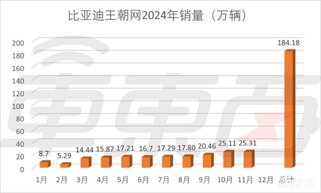 具体来看,根据比亚迪官方公布的数据,比亚迪2024年427.21万的销量中,在1至11月王朝网贡献了184.18万辆。
