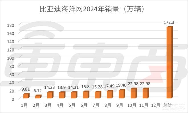 比亚迪2024年427.21万的销量中,根据比亚迪官方公布的数据,在1至11月海洋网贡献了172.3万,可以说王朝网和海洋网贡献了比亚迪2024年绝大部分销量。