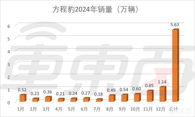 比亚迪旗下品牌方程豹官方表示,方程豹2024年12月销量为1.14万辆,2024年全年销量为5.63万辆,值得注意的是2024年12月方程豹单月销量破万。