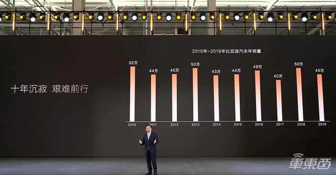 2010年至2020年,比亚迪的年销量一直在50万辆左右徘徊。