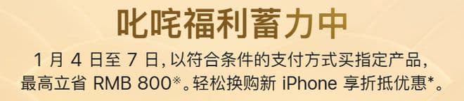 据苹果中国官网消息,1月4日至7日,苹果中国计划推出“叱咤福利”新年促销活动,活动期间以符合条件的支付方式买指定产品,最高可优惠800元,每位顾客每个产品类别限购 2 件。相关话题#苹果官网突然降价#1月2日午间冲上微博热搜第一。