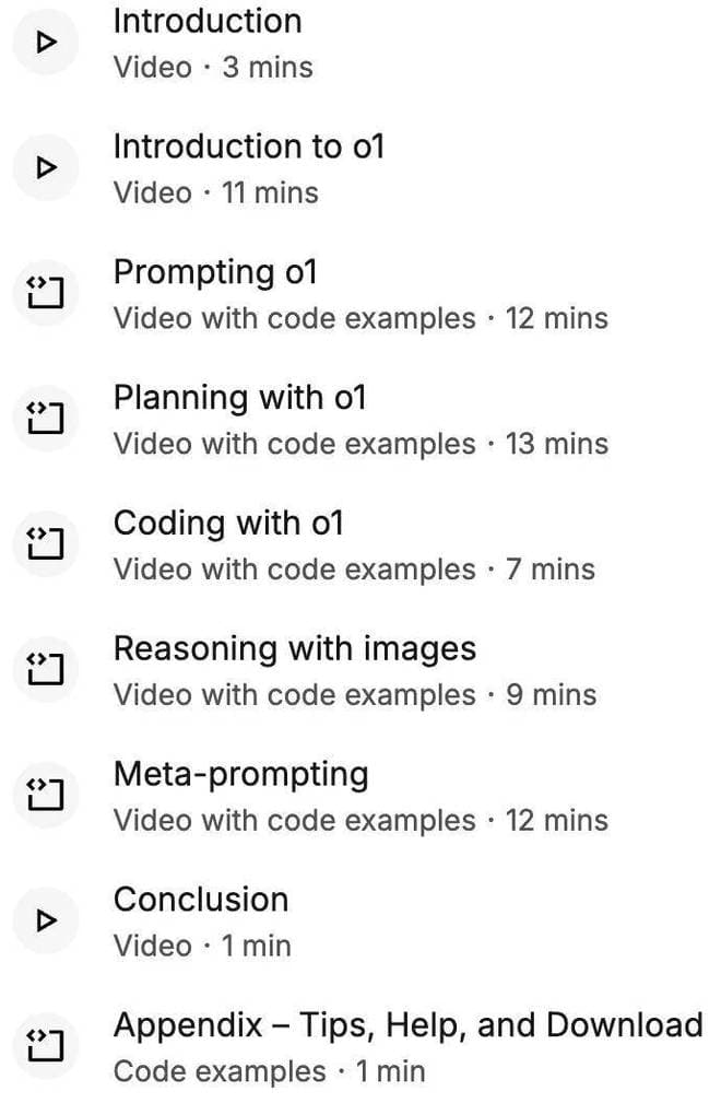 学习识别 o1 模型适合哪些任务,以及何时需要使用更小或更快的模型,或将这两者结合起来。了解使用 o1 进行提示的四个关键原则,并探索性能上的差异。实现一个多步骤任务,其中 o1 作为协调器创建规划并将其交给 4o-mini 模型按顺序执行规划,平衡智能和成本之间的权衡。使用 o1 执行编码任务,构建新应用程序、编辑现有代码,并通过在 o1-mini 和 GPT 4o 之间运行编码竞赛来测试性能。使用 o1 进行图像理解,并了解它如何通过层次推理获得更好的性能,其中它会预先产生延迟和成本,预处理图像并使用丰富的细节对其进行索引,以便稍后用于问答。学习一种称为 Metaprompting 的技术,以使用 o1 来改进提示。