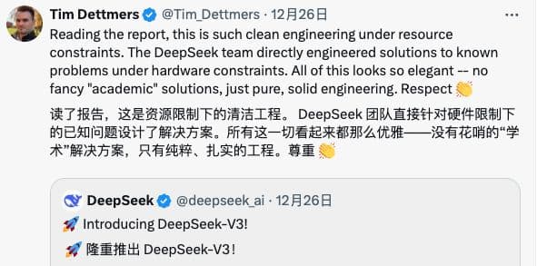 知名 AI 评测博主 Tim Dettmers ,直接吹起来了,表示 DeepSeek 的处理优雅 “elegant” 。